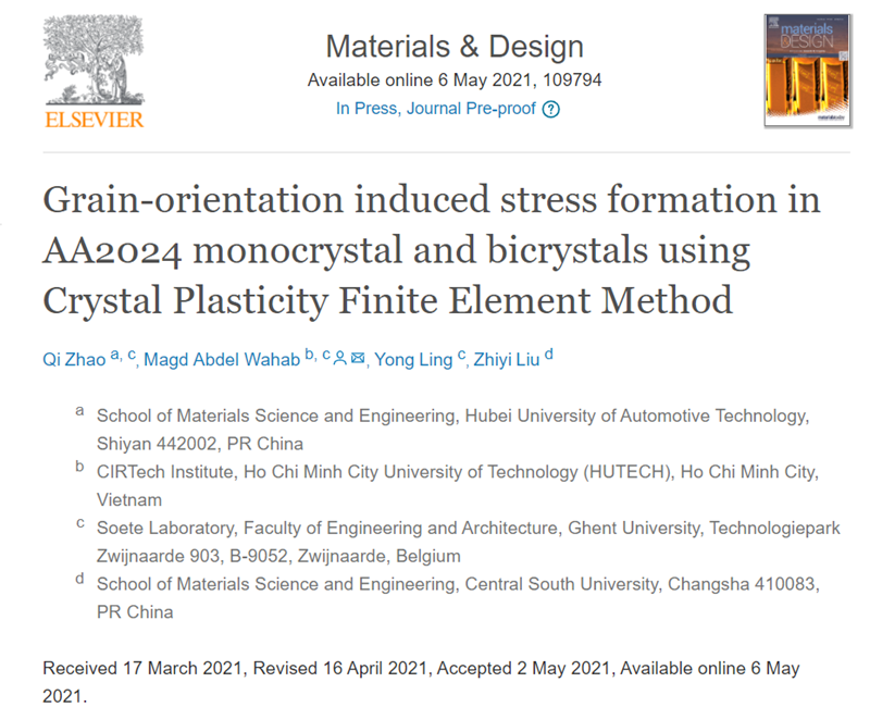 本网讯(文/赵齐)最近,国际材料科学顶级期刊《Materials & Design》(中科院1区top期刊,IF=6.289),刊登了国产精品永久久久久久久久久|91精品无码国产在线观看一区|久久人爽爽人爽爽ąV无码自慰|最新无码国模国产在线|2020最新无码国产在线观看材料学院和比利时根特大学有限元实验室的联合研究论文《Grain-orientation induced stress formation in AA2024 monocrystal and bicrystals using Crystal Plasticity Finite Element Method》。我校材料学院赵齐副教授为文章第一作者,比利时根特大学工程系Magd Abdel Wahab教授为文章的通讯作者。参与合作研究的还包括比利时根特大学工程系凌勇研究员及中南大学材料学院刘志义教授。