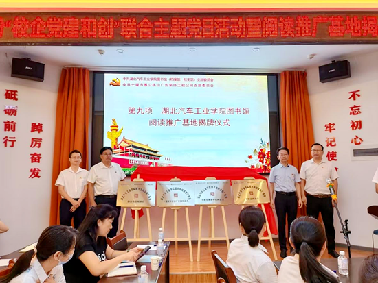 本网讯(文/图 王红)7月2日上午,我校图书馆(档案馆、校史馆)党支部联合愚公移山广告有限公司、十堰市广告协会,在奥体中心共同举行图书馆阅读推广基地揭牌仪式。